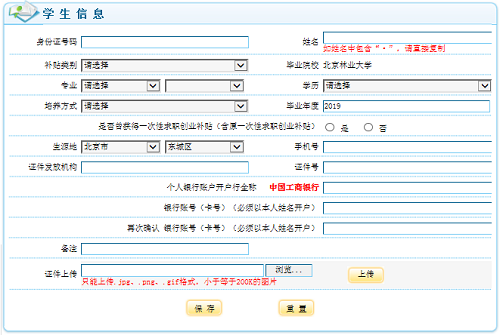 各学院申报负责老师登陆“北京地区高校毕业生一次性求职创业补贴申报系统”,于10月3日前通过系统录入申请人信息,身份证、和相关证明图片(上传图片需正向,否则影响审核)。