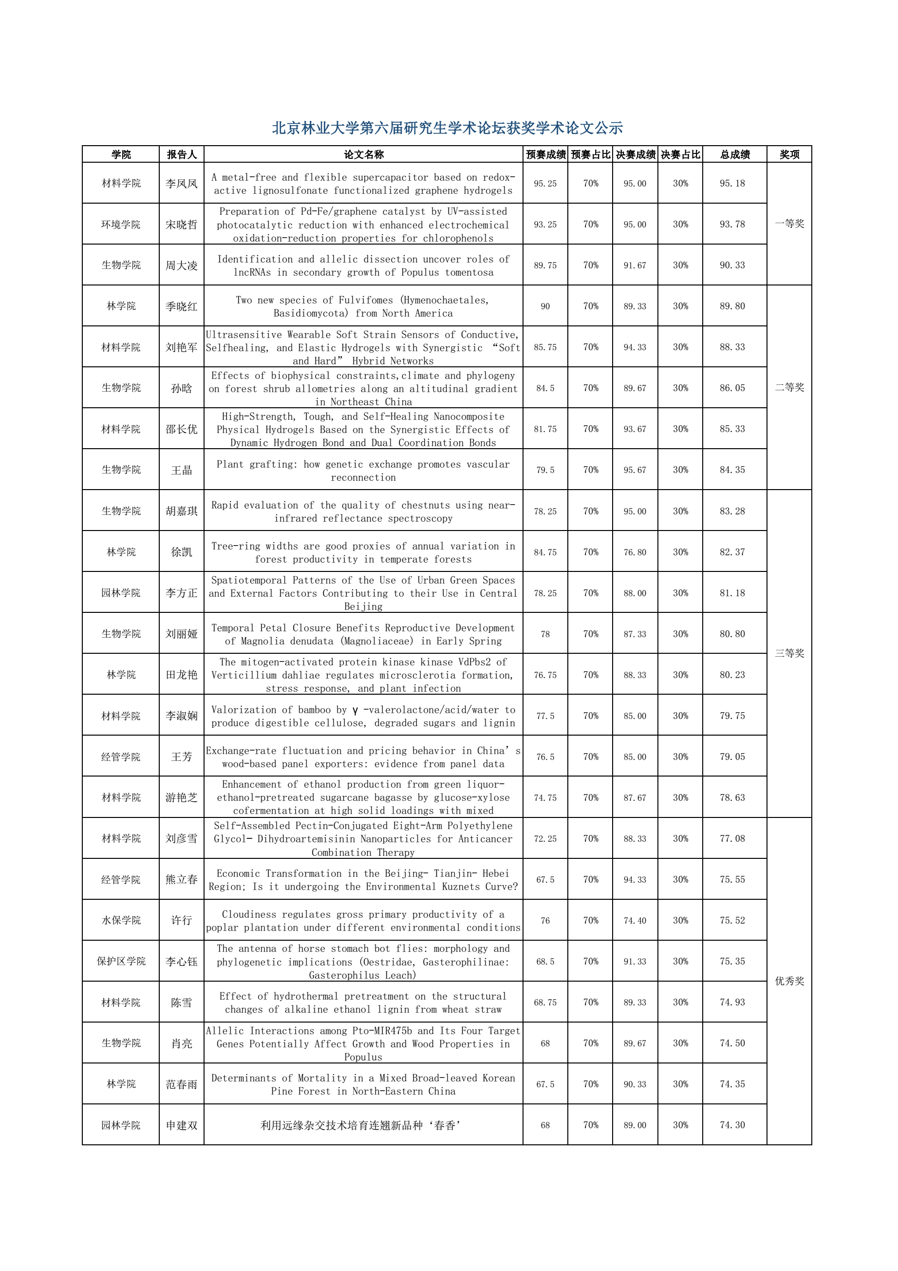 北京林业大学第六届研究生学术论坛由研究生院、党委研究生工作部组织,经个人申请、专家审核、现场答辩等环节,最终确定24篇获奖论文。其中一等奖3篇,二等奖5篇,三等奖8篇,优秀奖8篇。现对获奖情况予以公示。
