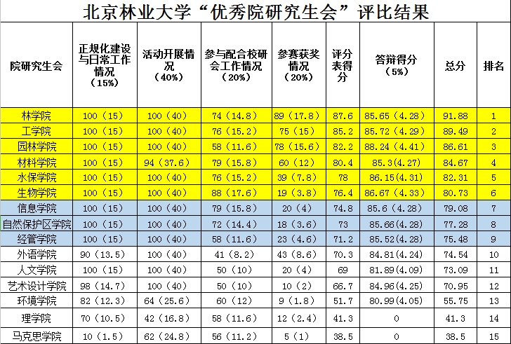 2016-2017年度“优秀院研究生会”评比答辩工作已经结束。目前,北京林业大学研究生会工作人员已严格按照《北京林业大学“优秀院研究生会”评定办法》,对各学院上交材料及答辩成绩进行了汇总、复核,现将北京林业大学2016-2017年度“优秀研究生会”最终评定结果公示如下: