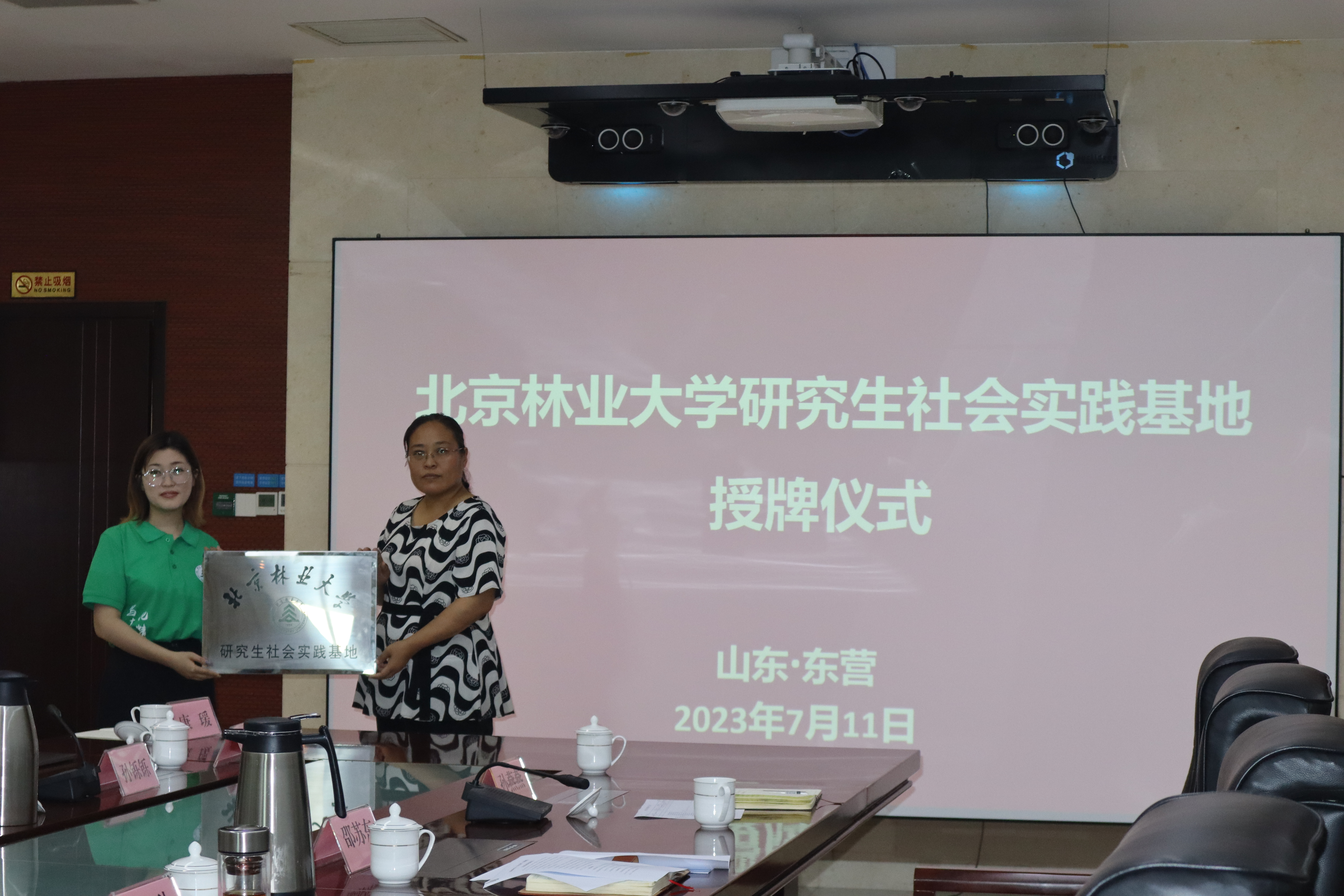 会上,北京林业大学党委研工部老师向东营市自然资源和规划局对本次社会实践的大力支持表示诚挚感谢,介绍了实践团队的相关情况,并向东营市湿地保护中心授“北京林业大学研究生社会实践基地”牌匾。
