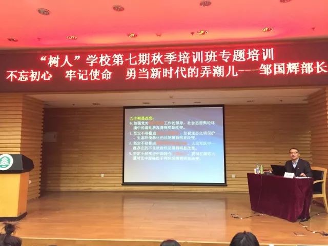 11月28日,“树人”学校第七期秋季培训专题培训课程成功举办,本次课程邀请到北京林业大学党委组织部部长、机关党委书记、“树人”学校副校长邹国辉老师为学员做了“不忘初心 牢记使命 勇当新时代弄潮儿”的专题辅导报告,研工部相关老师参加了本次活动。